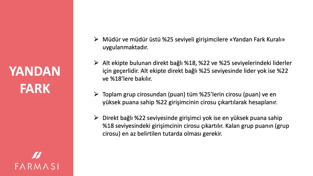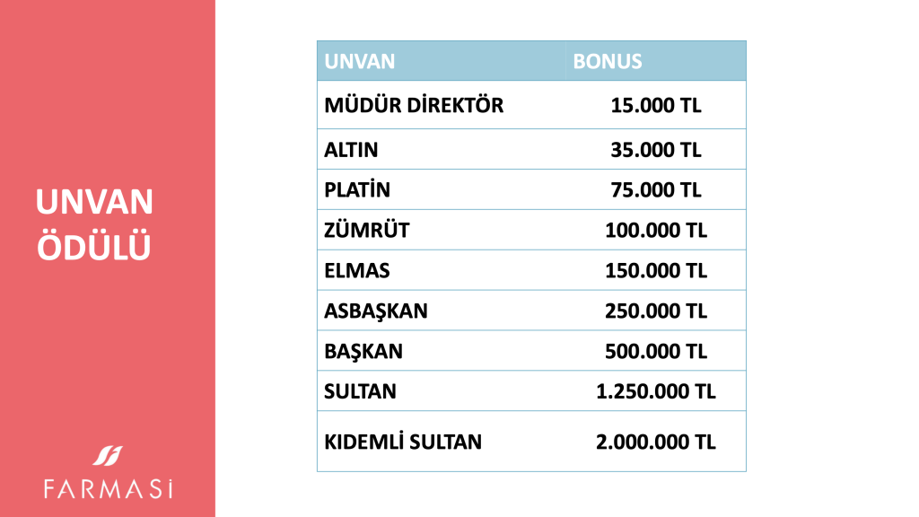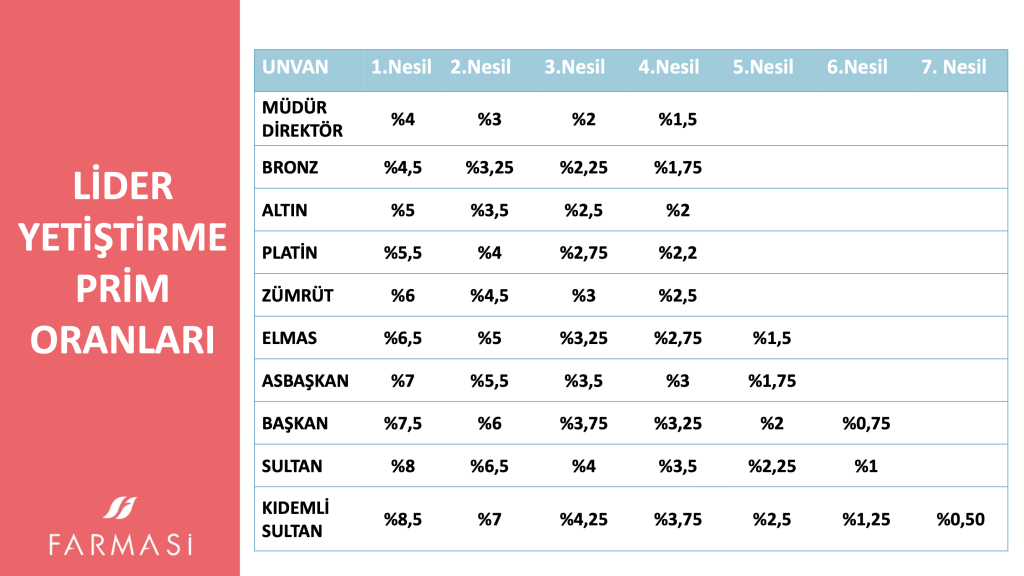 Farmasi Gelir Elde Etme Planı, gelirlerin çeşitli seviyelerde oluşmasını sağlar. Komisyon oranları, ürün satışlarına bağlı olarak %30’dan başlayarak artabilir. Satış hacminize göre bu oranlar daha da yükselebilir. Ayrıca Farmasi, başarı seviyelerinize göre bonuslar sunar. Örneğin, belirli bir satış hedefini tutturduğunuzda ek gelir elde edersiniz. Liderlik bonusları, araç destekleri ve seyahat ödülleri gibi çeşitli teşvikler de bu planın bir parçasıdır.