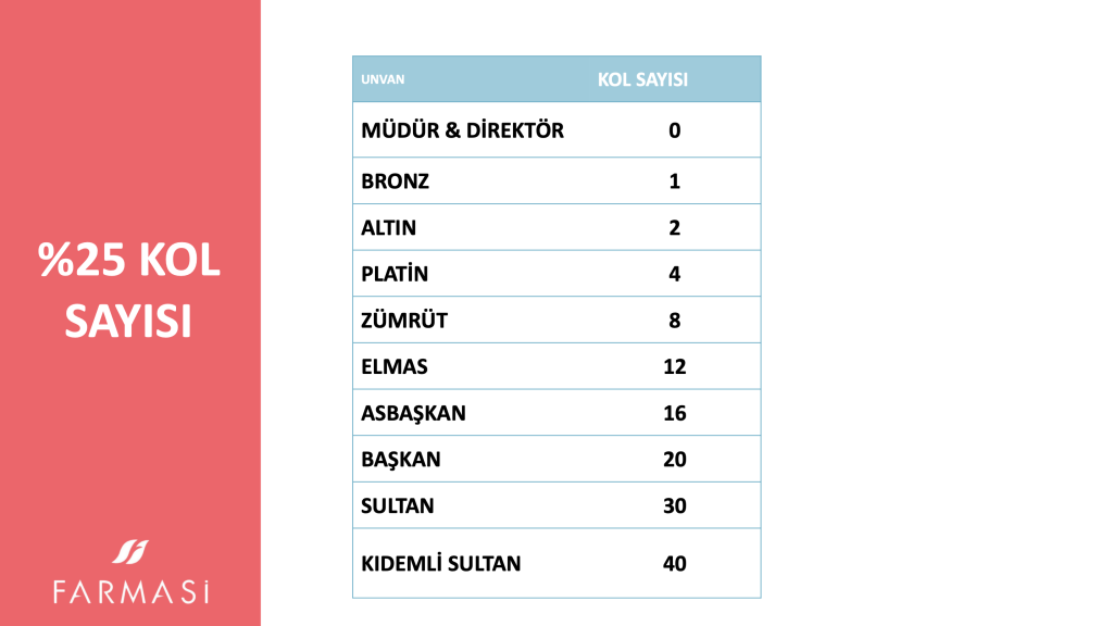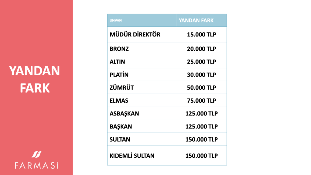 Farmasi’ye üye olduktan sonra gelir planına dâhil olmak oldukça kolaydır. İlk adım, ürünlerinizi tanıtmak ve satış yapmaya başlamaktır. Satış yaptıkça komisyon alırsınız. Daha sonra, kendi ekibinizi oluşturarak gelirlerinizi artırabilirsiniz. Farmasi, size hem bireysel olarak gelir elde etme fırsatı sunar hem de bir takım lideri olarak pasif gelir sağlayacak bir ağ kurmanızı destekler. Bu süreçte size verilen eğitimlerle daha fazla başarı elde etmeniz sağlanır.