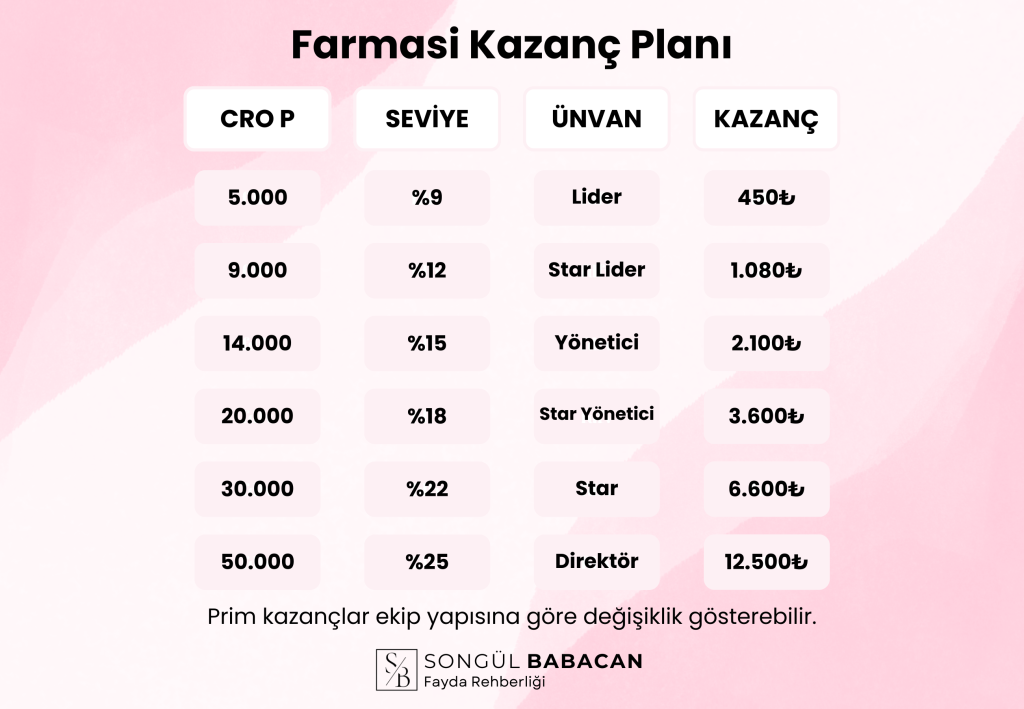 Farmasi’den kişisel olarak yada ekibinizle birlikte yapmış olduğunuz aylık toplam alışveriş tutarlarına göre Farmasi nakit para vermektedir, bu vermiş olduğu nakit paranın ismi Prim’dir. 5.000 TL cirodan itibaren seviye alarak kazanmaya başlayacak olan Farmasi üyeleri, 5.000 TL ciroda %9 prim alabileceklerdir. 5.000 TL’de de bu brüt tutar 450 TL’dir.